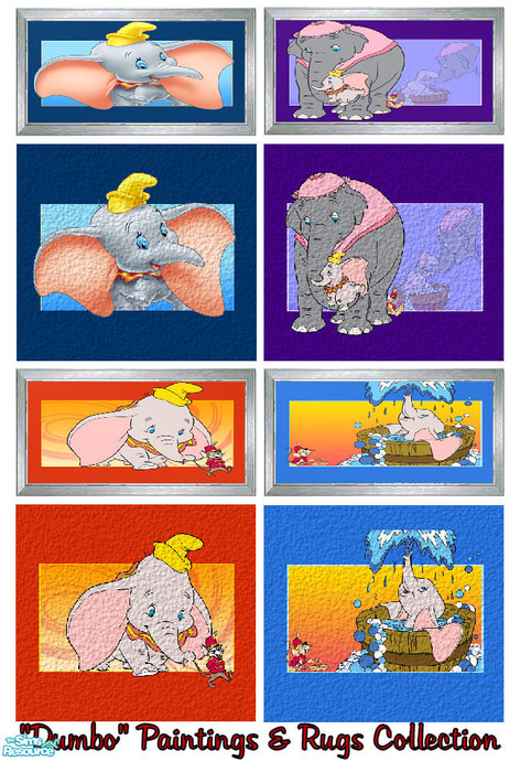 This is a set of 4 paintings, with 4 matching rugs, featuring your favourite lovable, little elephant, \'Dumbo\' from Walt Disney. The paintings are re-colours of the \'Poisonous Forest\' painting (base game), and the rugs are re-colours of the \'Bullseye Throw\' rug. Look great in any rooms! Enjoy!