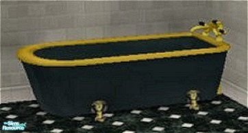 Your Goth king or queen will adore luxurating in this black and gold porcelain tub so much you may have trouble getting them out! Part of the Scuito Black Bathroom Set by Skippyscatt.