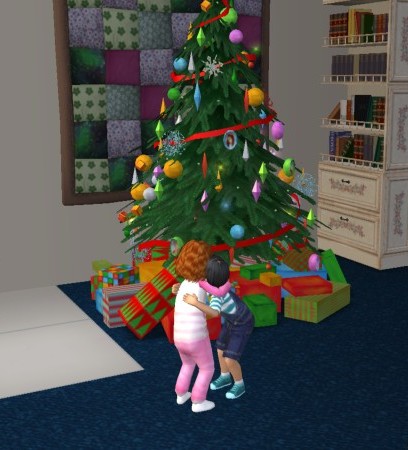 Two little sims in awe of the Christmas tree.