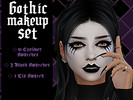 Gothic Makeup Set including an eyeliner with 6 separate swatches, 3 face swatches (one with lips covered, one without lips covered and one with just the cheek contour) and 1 lip swatch.